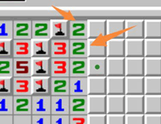 橙色箭头所指的4,周围已有3个雷通过其他方式判出,因此真实数字为1橙色箭头所指的2,周围已有1个雷通过其他方式判出,因此真实数字为1