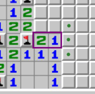 橙色箭头所指的2,周围已有1个雷通过其他方式判出,因此真实数字为1,可以使用121定式。
