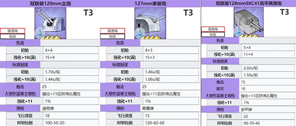双联120强力通常弹;127单装炮过渡用高爆炮;紫SKC41过渡用***。