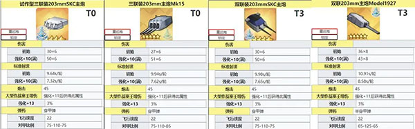 三联203markIX(右一),最强高爆弹之一,装备研发制造,dps高于阿尔及利亚炮,低于路易炮。射速较慢。