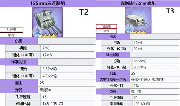 三连155,三期开箱子非常容易获得的炮,由于散布问题作为轻巡主炮一般,可作为战列副炮。