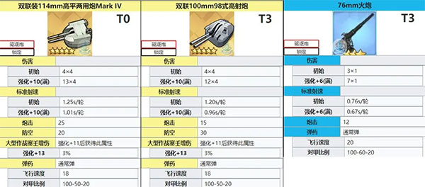 76火炮(右一),通常弹,射速最快的主炮,几乎没有炮击输出,用于主炮占比非常少的驱逐舰。