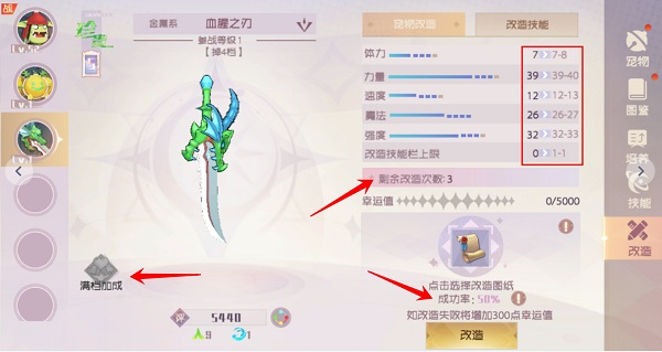 我们可以看出,首先选自己心仪的宠物,点击选择改造图纸,这时候会显示改造成功率,改造成功就会如图中所显示的,在宠物基础属性上进行增强;但是改造失败的话,也会增加幸运值,当幸运值到最大化时,改造会百分百的成功!