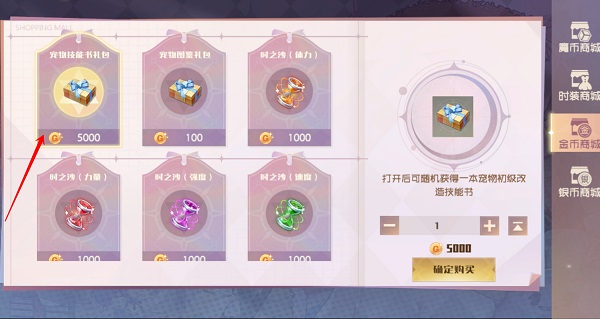 那么宠物天赋技能书从哪里来呢,最简单的获取方法就是从金币商城购买,5000金币一个,购买了打开后,就可以学习天赋技能了。