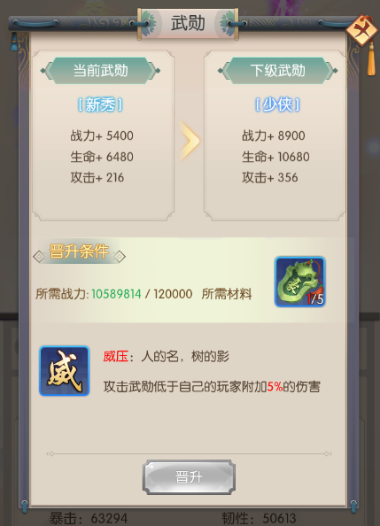 2、武勋从低到高分别为入门、初学、新秀、少侠、大侠、名扬、豪杰、名宿、宗师、超凡等;
