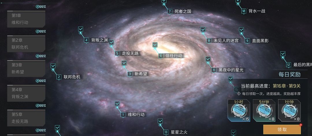 然后就是前期的主线支线任务,在有体力的情况下选择优先完成。可以用钻石去购买体力加快任务完成进度。每一轮完成目标给予的经验和物资都是非常丰厚的,在前期开荒的时候一定是拉满,保证进度。