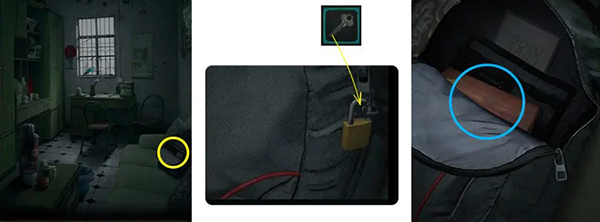 8、用“钥匙”打开401房门,拾取“剪刀”,将“积木”放入门锁机关,完成小游戏,进入卧室。
