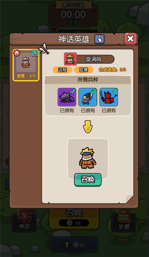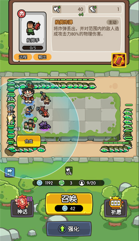 2、召唤英雄也可以以三合一的方式合成更高级别的英雄,最终通过特定的组合召唤神话英雄来横扫一切;