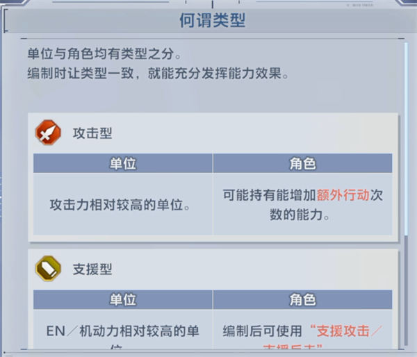 角色的选择就是建立在机体选择之上,首先,角色和机体都有三种类型,攻击、支援、耐久,选择角色一般要保持角色类型和机体类型一致。