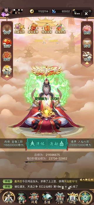 2、这期间,可以做做任务,先把游戏前期资源领取了,加门派,学功法。打坐收集修为,集气提升境界好轻松。先定个小目标,先升级到炼气十阶。十阶可以开启淬体与渡劫玩法,从这里开始,修真之路正式开启。
