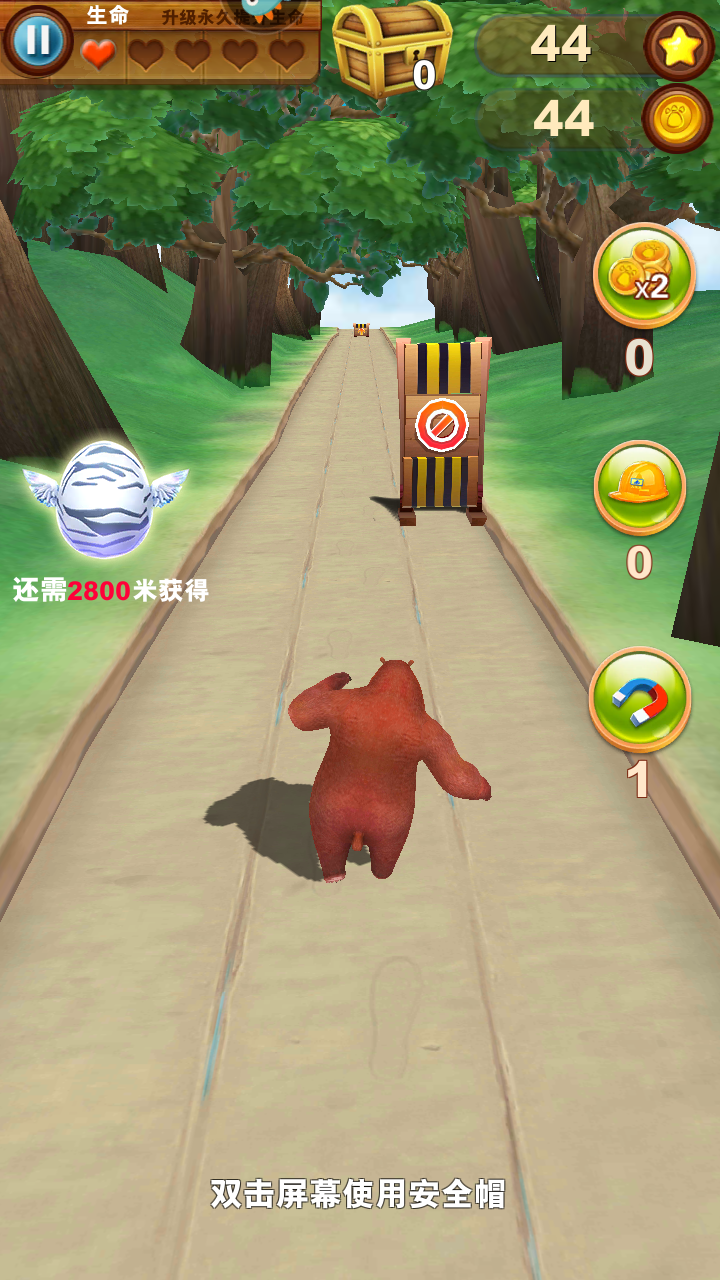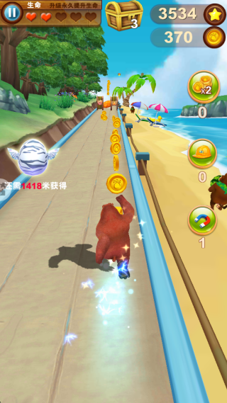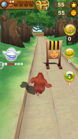 1、无尽模式:这是游戏的核心模式,玩家需操控熊大在森林、悬崖、古镇等多样化场景中持续奔跑,躲避光头强的追击与各类障碍物。该模式以生存距离和收集金币数量为评分标准,支持玩家不断挑战自我极限。