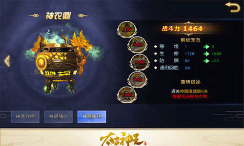 神农鼎完成重铸后五大技能都将得到强化,全面提升玩家在野外续航、副本战斗、PVP各方面的能力。虽然前身是上古大神的药鼎,游戏中神农鼎却属于功能多样的万金油神器。初始的“神·神农回春”属于永续型技能,激活后每10秒为玩家回复一次血量,而且最大生命值6%的效果十分可观,算好时间进入战斗往往能收获奇效。