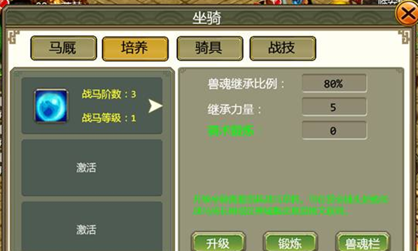 为坐骑系统添加马厩、培养、骑具、战技等四个界面,玩家获得所有坐骑均可以放入马厩。