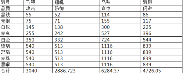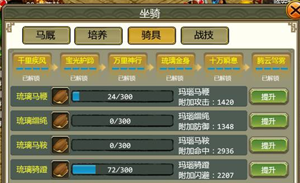 每件骑具提升一次品质都会为角色增加一定的附加属性;