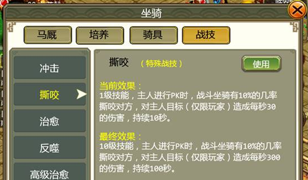 1. 展示主角已学(或未学)的基础坐骑技能信息、特殊技能信息(等级、功能描述)
