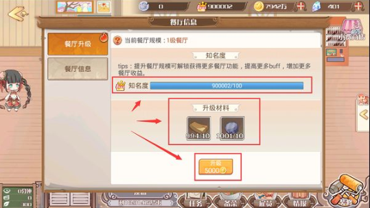 餐厅升级餐厅默认是只能雇佣3名雇员(1名主厨+2名服务员),升级餐厅可以解锁更多雇员位。当知名度满足餐厅升级要求,就可以进行餐厅升级:点击情报→餐厅升级(升级材料可以在市场或探索中获取),升级会会消耗知名度,但是知名度的总上限不变。