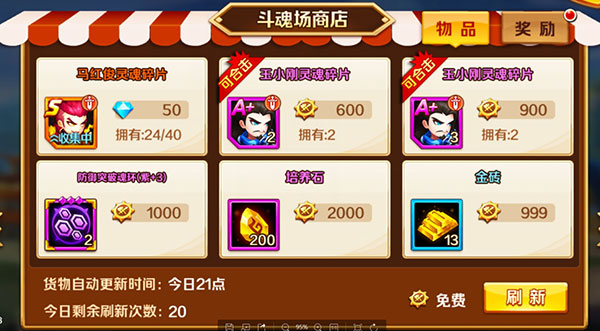 每天21:00会按照当前的斗魂场排名,为玩家发放奖励,包括钻石、斗魂币、培养石和金魂币等奖励。