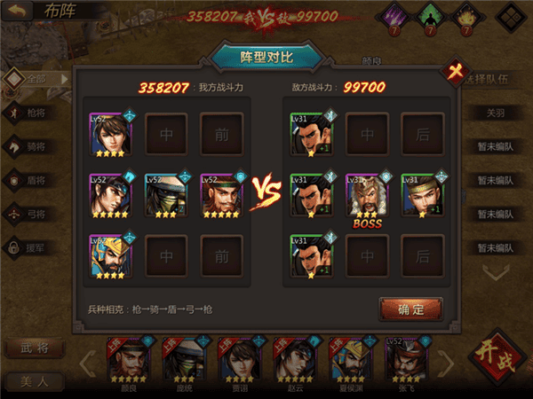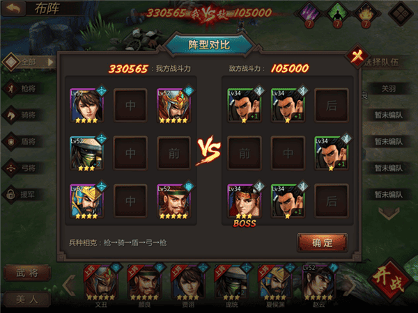 首先观察敌军布阵,在布阵上我们可以看出关卡BOSS是一个三星盾将,而前排是3个枪将,所以这次布阵以弓为主,以骑为辅。敌军采用的布阵“前1、前2、前3、中2、后2”,所以我方的盾将就不能是文丑那种嘲讽敌军的盾将,要换成直接减免伤害的武将。所以我方布阵为“前2、中2、后1、后2、后3”,这样在敌我交战的时候我方“后1、后3”的弓将直接对敌军“前1、前3”的枪将造成伤害,快速解决战斗,并支援2路。
