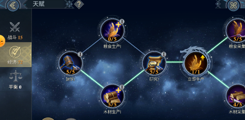 经济天赋的加点,如果是和平时期或者不喜欢打仗的玩家,建议主加经济一栏,经济天赋可以提升采集速度和采集的产量,加快自身采集的速度,一般自己有小号的可以这样加点,经济天赋就可以全部往下加着走,提升各种资源的采集速度和产量。