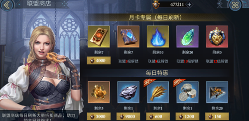 在联盟商店中“个人勋章”购买各类资源,3000勋章可兑换亚瑟王灵魂,对于平民玩家来说是比较不错的选择,可每天完成各项联盟任务攒勋章兑换。其他资源可按需兑换,可优先选择-90%的折扣商品,资源类可暂缓考虑(因为日常也可获取,没必要浪费勋章),装备锻造之印可优先选择,锻造装备可提升部队实力。