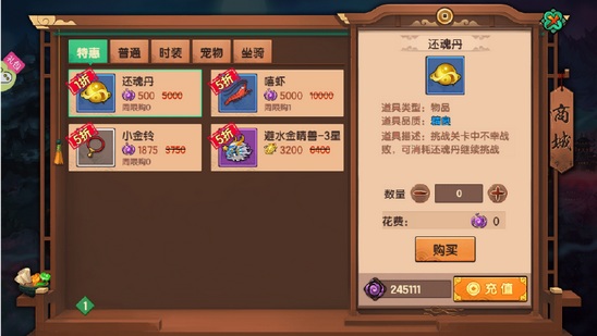 还有的就是商城里面不是全部都只能用点券买的,特惠里面有每周限购的东西,还魂丹和小金铃每周必买,还魂丹可以复活攒着也没事,小金铃的会因为铃铛获取通道太少了,用元宝买的话太亏了,至于嘻虾的话前期可以买一个,后期打到第二章地图的话可以不用买,至于碧水金晶兽的话平民不建议买