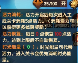 这体力功能的意思是每天恢复100体力,打一关的话需要5体力才可以打,当然新手刚开始玩的话,遇到自己打不过的关,可以关掉体力多试几遍,不过关掉体力打得关经验和灵魂十分少,掉宝率也下降了,至于时光能量的话是来源于你用不完的体力可以留到明天用