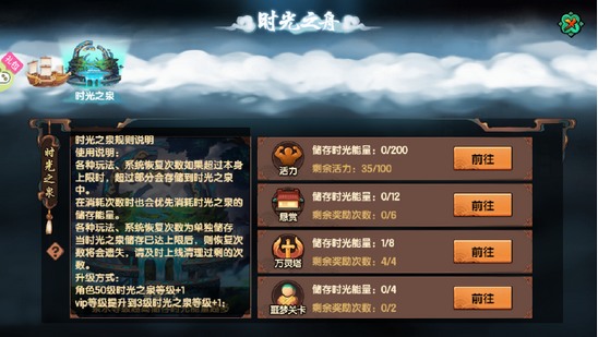 时光之泉的话可以储存一天没用光的活力,悬赏等,如果你角色等级达到50级或者vip等级达到3级的时候时光之泉等级将会+1,每当时光之泉等级+1的时候你的储存天数将会多一天