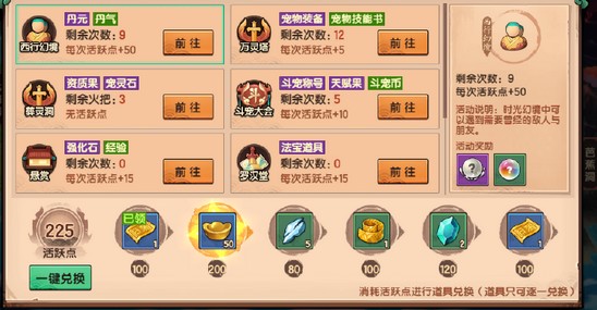 至于活跃的话有时间可以全部都做完,元宝的话如果你培养宠物可以买宠物之书炼,或者你可以去买的仙织革什么的