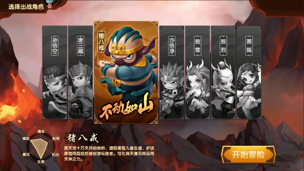 属于肉坦类型的角色,虽然移动速度慢,机动能力不强,但是他的血很多,所以在生存能力上是一顶一的存在。所以在战斗的时候,玩家使用猪八戒在前排站撸敌人,避免让后面的队友受到了攻击。因此猪八戒的玩法也是非常简单的,站在前面挡伤害让队友输出。