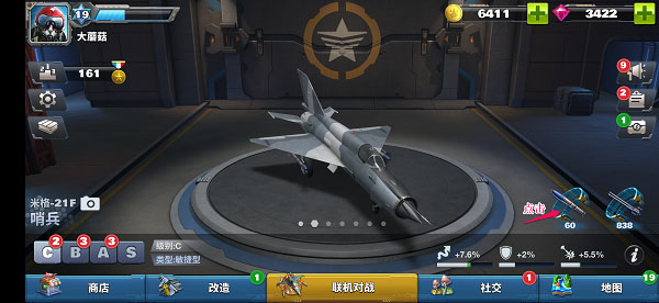 空战争锋是一款3D飞行射击类手机游戏,支持Android与iOS平台全球联机对战。游戏以真实战机为原型,收录了超过100款可操控机型,包括美系战机“F-22”、英国皇家空军战机“台风”等,战机按照性能分为敏捷型、均衡型、防御型、攻击型四类,并按照级别分为C/B/A/S四个级别。游戏画面精美,采用Unity引擎打造,拥有晴雨动态天气系统,精确的大气散射和耀眼阳光使空中场景更加逼真。玩家可以飞穿于众多海岛、海港、璀璨城市和热带沙漠之间,享受高度写实的军事空战体验,玩家可以根据任务需求和自身喜好选择不同类型的战机,如侦察机、攻击机等,通过科技系统提升战机性能,升级科技可以提升对应的属性加成,如敏捷、速度、装甲等,提供重力感应与虚拟摇杆两种操作模式,支持360度特技飞行。玩家可以根据个人操作习惯调整操控按键位置,选择最适合自己的操作方案。