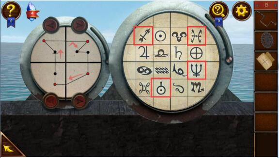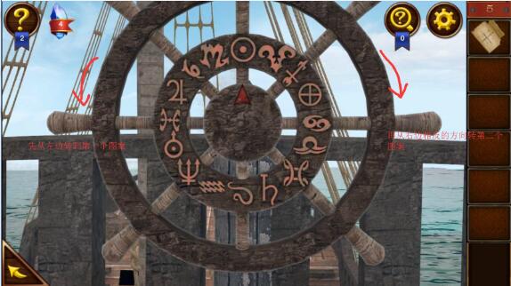 7、现在用舵盘上的指针把雷达上对应的4个图案按照顺序逐个对应,这里千万注意,大部分人会卡在这里,指向第一个图案后,一定要向相反的方向转动,和保险箱的原理一样。