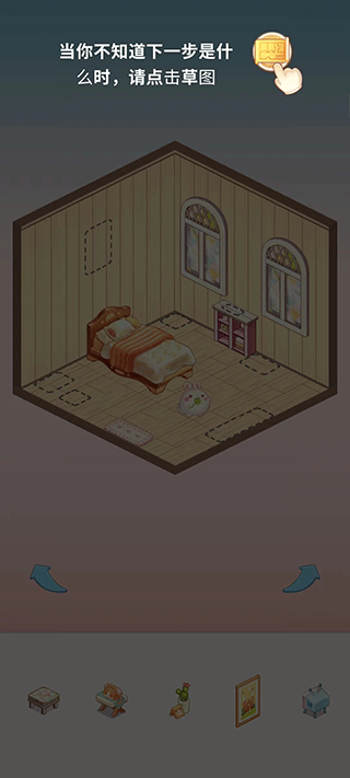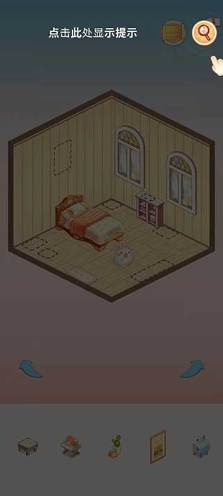1、玩家可以通过拖动家具至正确坐标,精准拼接来触发新场景。点击蓝色旋转标识可调整家具角度,灵活改变布局方向。轻触放大镜标志可获得提示线索,帮助通关。点击草图按钮可查看整体构造规划,避免误放。