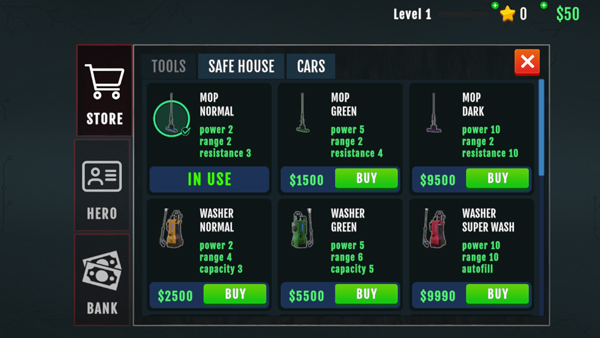 3、有时,你的装备需要升级。如果您的灯或手电筒不够亮,请购买新的。如果血太多,请升级您的强力清洗喷嘴。在每次任务之前检查可用的特权,并增强您的清洁武器库,使您的工作更轻松。