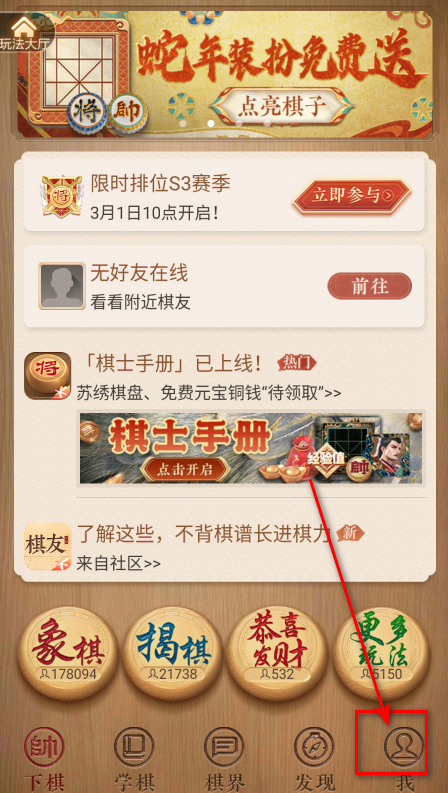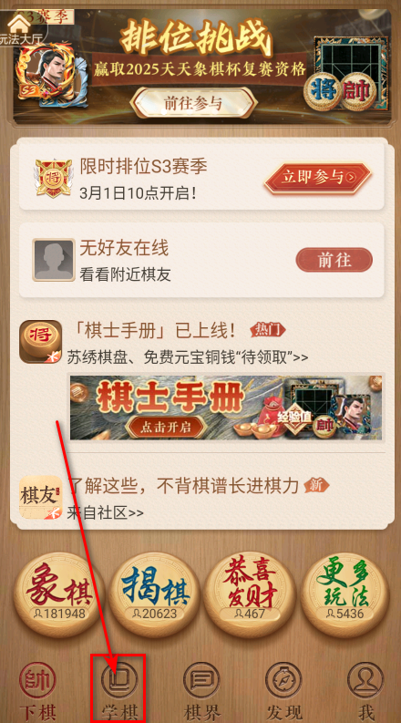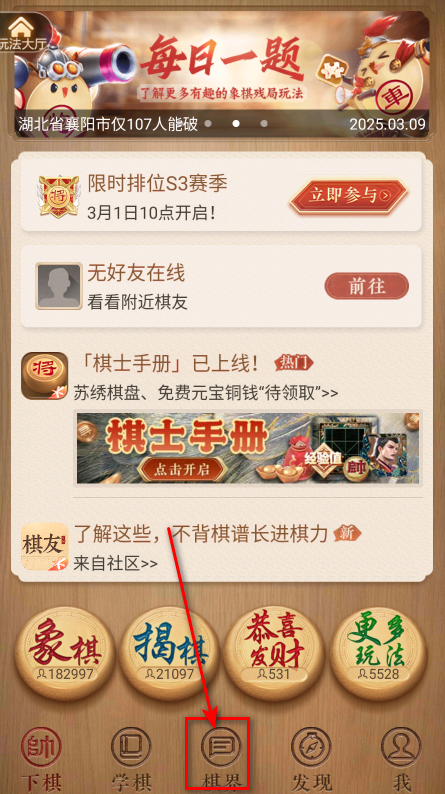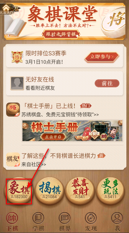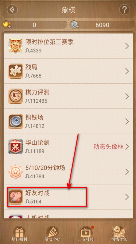 打开游戏主界面,点击【象棋】模块(经典玩法入口),选择【好友对战】选项。