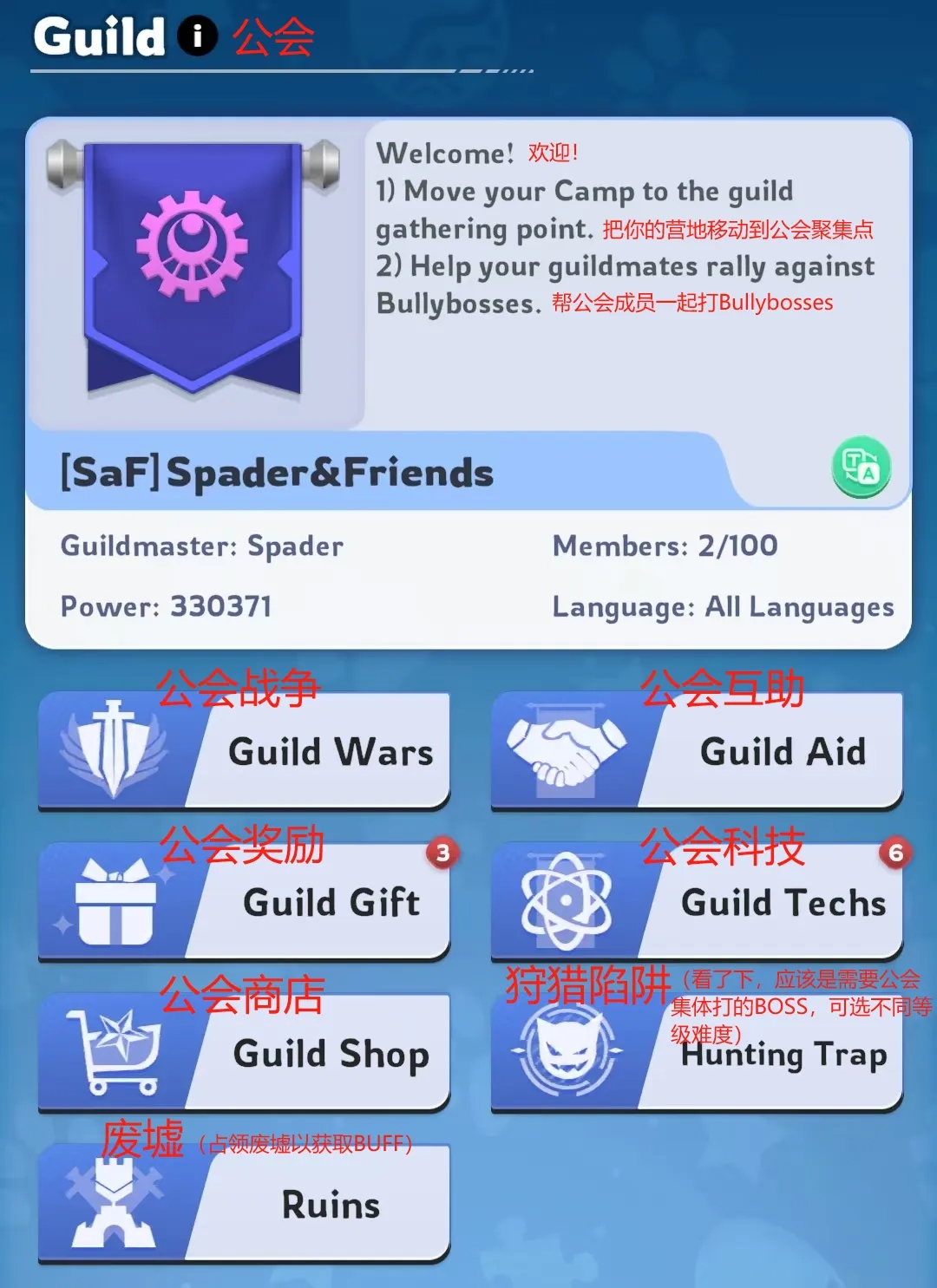 4、就公会菜单来看,需要玩家合作完成的PvE、PvP内容应该都是有的;而且公告里写了让玩家把营地移至公会聚集点,这句话可能也意味着帕尔蒙生存公会团战有沙盘策略要素;