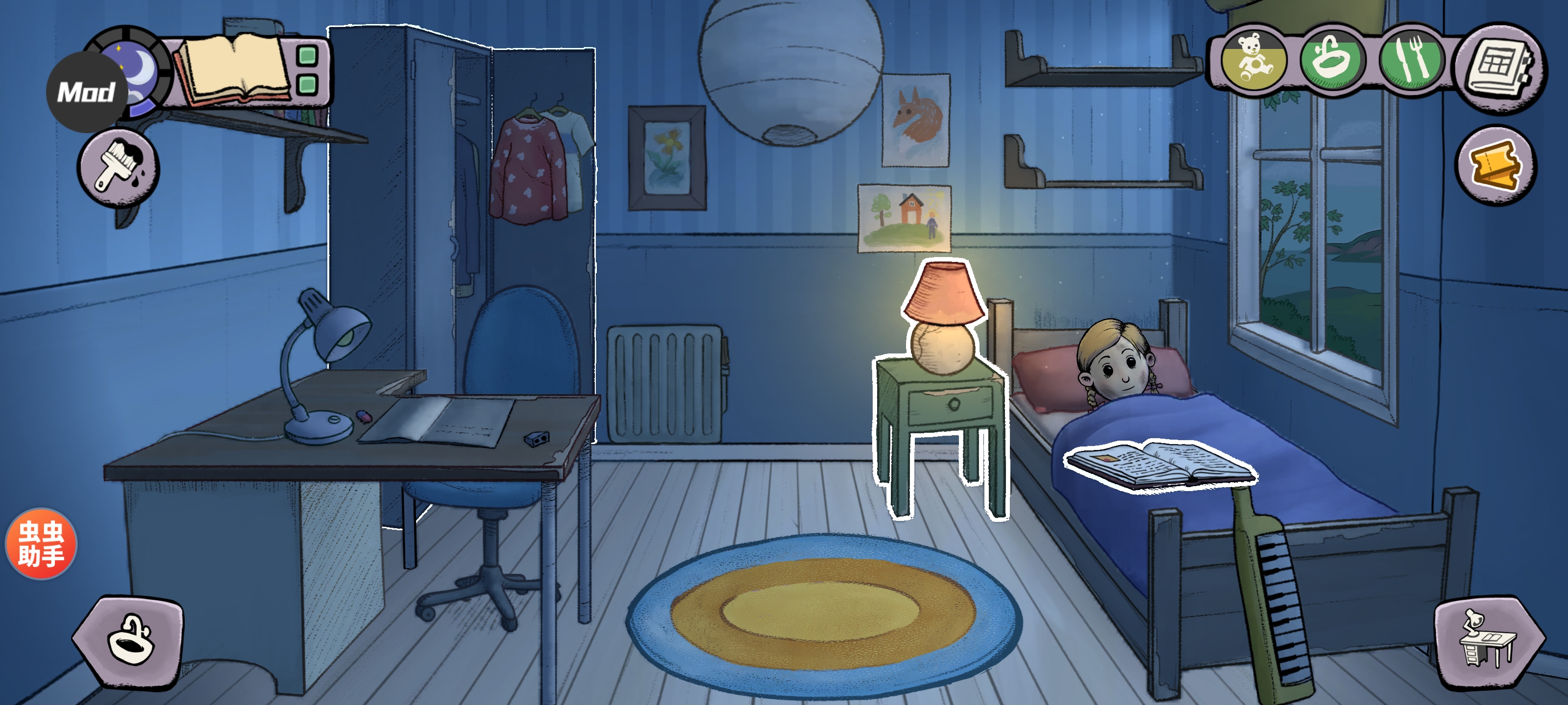 13、到来晚上玩家就可以要求孩子睡觉了,给她讲一讲睡前故事,随后点击“台灯”就完成这一天的任务了。