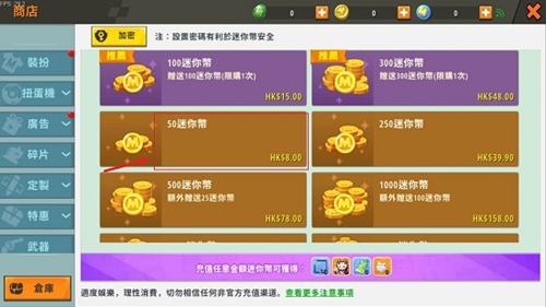 进入游戏后,点击主页上方迷你币右侧的“+”图标,或点击左下角的“商城”按钮(若未直接显示,可点击“<<”图标展开隐藏功能),进入“迷你币购买”页面,选择所需数量的迷你币并完成支付。