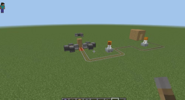 雪傀儡的放置,可以同样利用铁轨加矿车让它们固定在原处,当然,我认为还可以用一些其它办法来做到同样的效果,比如直接用船来固定,或许会更好。