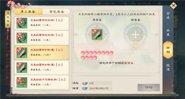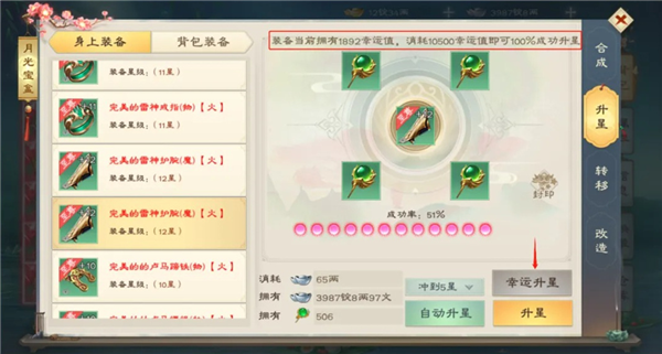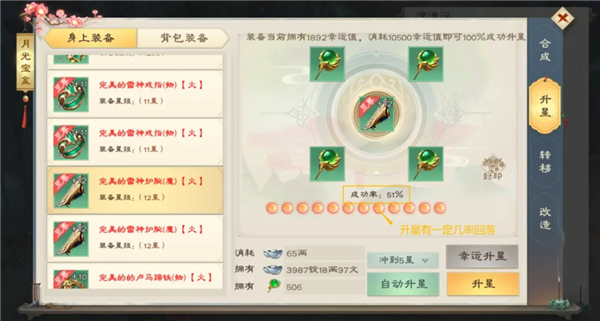 装备升星需要升级宝石以及银子,升级宝石会在各类任务、古战场、古迹boss以及各类boss中掉落,普通的升星会有一定几率升星失败或者是回落星值。升星成功会积攒幸运值,幸运值可以提供幸运升星的机会,可以百分之百升星,玩家可以在积攒足够的幸运值之后在比较高的星值时使用幸运升星。