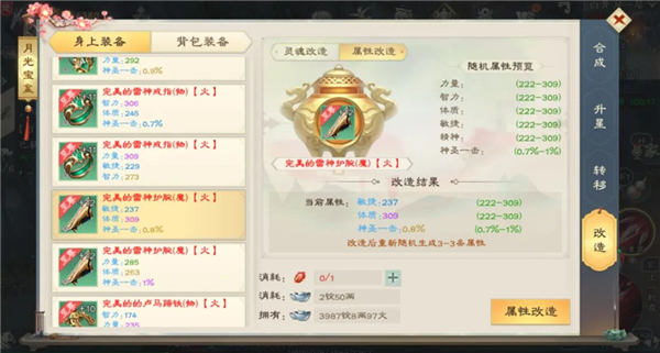属性改造主要改变的是装备的附加属性,可以通过洗练石进行改造。但是属性改造和灵魂改造都有一定几率弱化装备的性能。