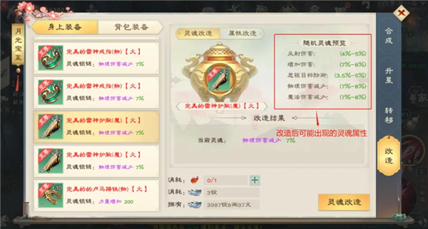 灵魂改造用于改变增强灵魂锁链里的灵魂属性,通过不同评价的灵魂石可以对不同品质装备进行改造。(如:传说灵魂石可以改造传说装备)