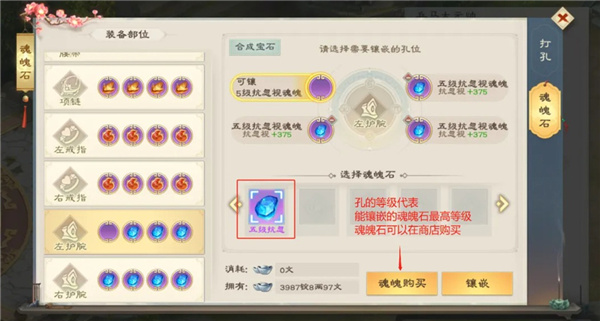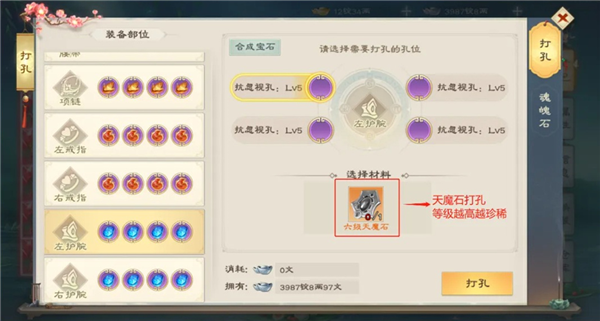 前方介绍的装备的升级改造大多都是为了提高装备的自身属性,镶嵌则是能够大幅度提高人物战力的方式。打孔需要天魔石,多在古战场和古迹boss中掉落,商店的拍卖行中也能购买,不过大多比较昂贵。玩家打孔之后可以镶嵌魂魄石,魂魄石可以通过银子购买。天魔石比较稀少,每天下午的古战场是玩家搜集天魔石的最好途径。