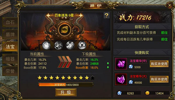 大幅提升暴击几率、暴击伤害,法宝碎片可通过材料副本、击杀BOSS获得,提升法宝可对BOSS造成额外伤害。