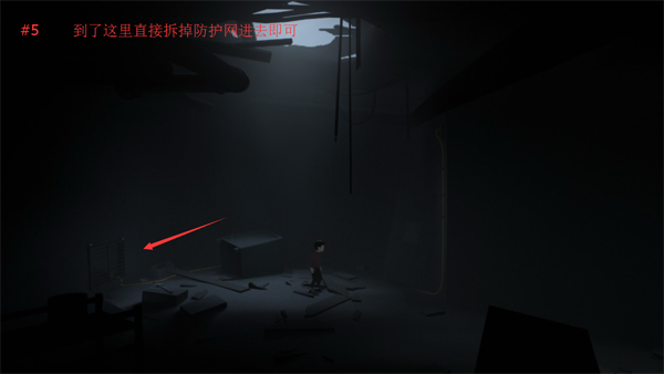 穿过木板,木板会断裂,让你掉到下一个房间。跳过右边的缝隙,然后从建筑右侧的管道爬下去。