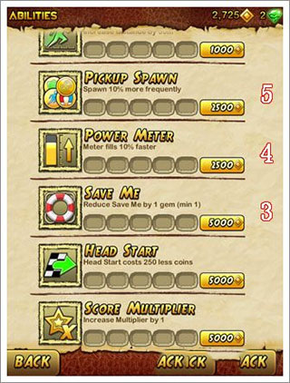 吃到金币后能量槽会增加,增满后会成荧光绿状态,这个时候双击屏幕任何位置就能使用特殊能力。能力会有多种选择,在此特别推荐使用如图所示的吸收金币的能力。 获得条件貌似是达到多少级,反正挺简单的,完成成就就能获得经验升级,当然他的成就是英文描述,请查看《神庙逃亡》人物技能介绍。大概就是上面这些技巧了,别看贴吧论坛什么的到处都是天大的数字,其中很大一部分都是靠修改器刷出来的,如果光凭自身技巧,那才是值得称赞。对了,之前我发了两篇文章就重点教大家怎么无限刷金币和无限刷钻石哟。