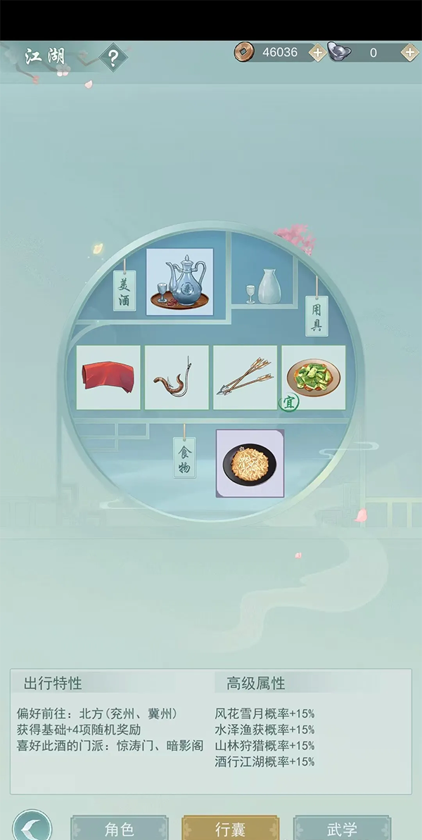行囊中的食物能决定目的地,美酒则有相应的喜好门派,特殊用具能增加时间触发概率,带上不同的行囊就能使每次出行触发不同的事件和奖励。
