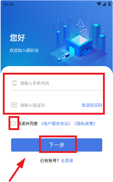 输入手机号,验证码,勾选阅读并同意 《用户服务协议》 《隐私政策》,点击下一步即可。