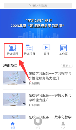 2、于首页选择"培训课程"功能,进入课程列表页面。