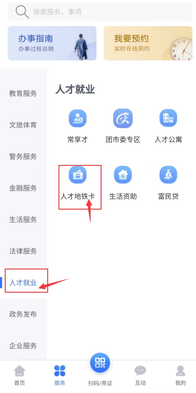 2、依次点击“服务”→“人才就业”→“人才地铁卡”模块申请。
