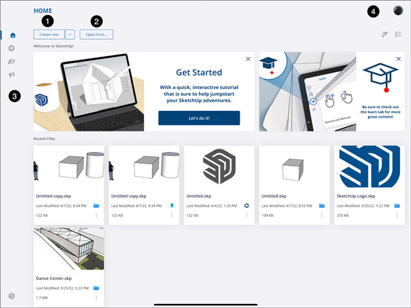 主屏幕是您在启动并登录到SketchUp 后首先看到的内容,其中包含以下内容: